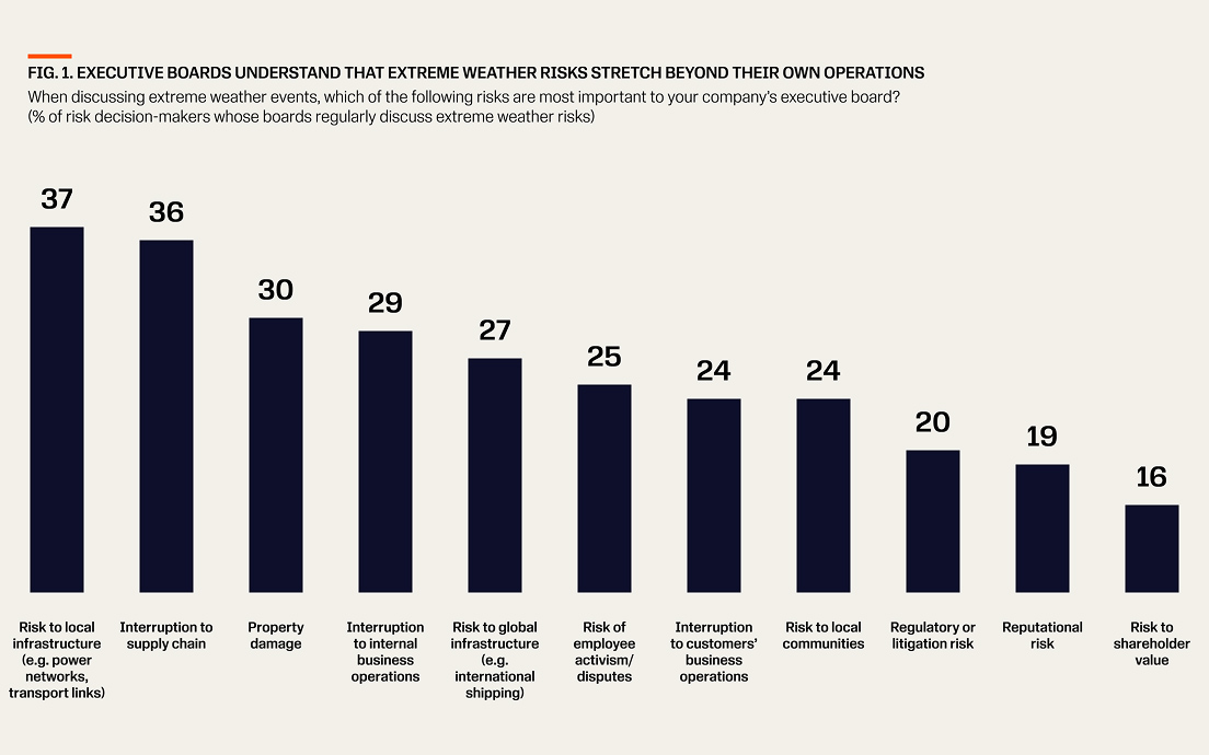 Not only are boards alert to extreme weather risks, but they are also aware of the far-reaching implications. According to our survey respondents, boards are equally focused on the risks that extreme weather poses to local infrastructure—such as power and transport networks— and to supply chains, as they are on property damage and interruptions to internal operations (see Fig. 1).