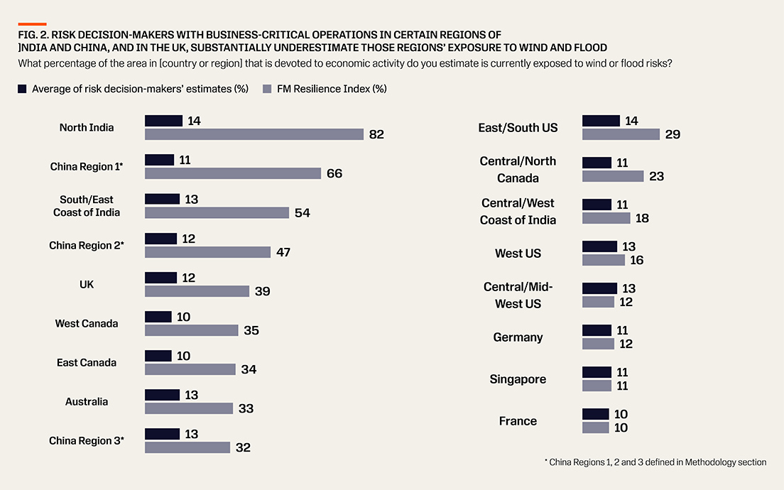 This revealed that 74% of risk decision-makers underestimate the exposure when compared to calculations in the FM Resilience Index. Estimates varied significantly by country and region: businesses with operations in North India, parts of China, and the UK, for example, substantially underestimate these areas’ wind and flood exposure (see Fig. 2).